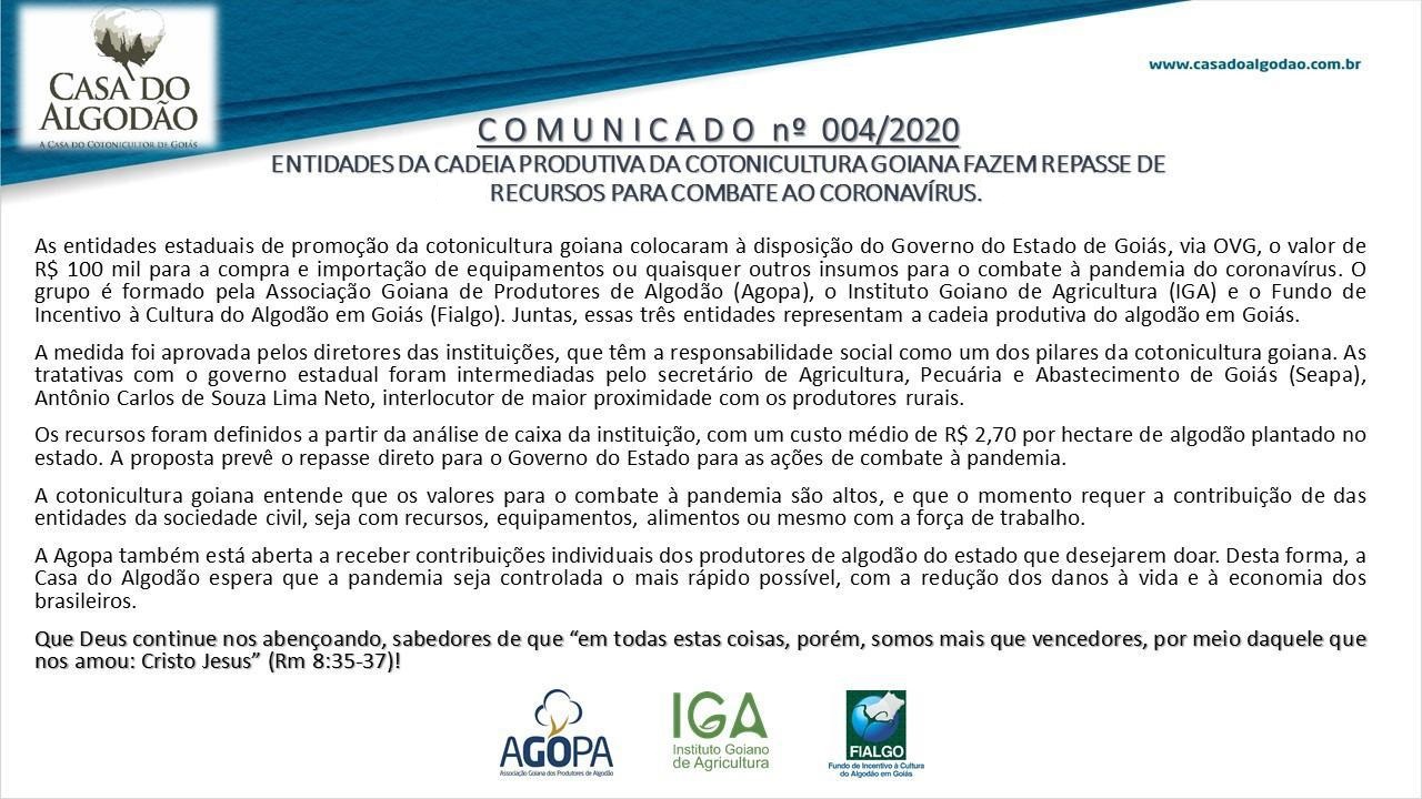 As entidades estaduais de promoção da cotonicultura goiana colocaram à disposição Do Governo do Estado de Goiás, via Organização das Voluntárias de Goiás (OVG), o valor de R$ 100 mil para a compra e importação de equipamentos e insumos para o combate à pandemia do coronavírus. O grupo é formado pela Associação Goiana de Produtores de Algodão (Agopa), o Instituto Goiano de Agricultura (IGA), o Fundo de Incentivo à Cultura do Algodão em Goiás (Fialgo). Juntas, essas três entidades representam a cadeia produtiva do algodão em Goiás.